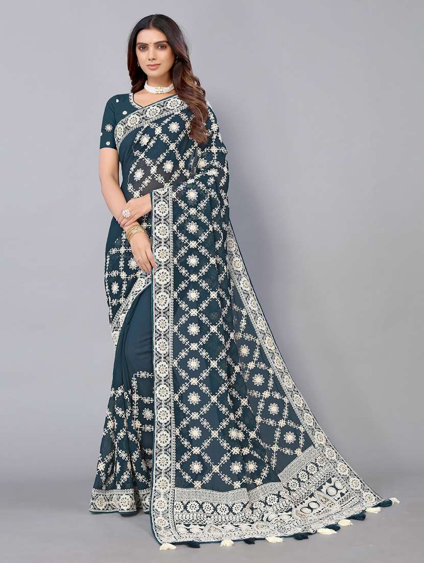 Bring out the best in you when wearing this teal colored saree. This saree is made of georgette chikankari work fabric which is highlighted with beautiful lucknowi weaving work. This saree is paired with matching fabric unstitched blouse piece which can be stitched as per your requirement. This saree is comfortable to wear and care. You can wear this saree for casual outings, office, regular social meets and other homely events. Pair it with stylish accessories to complete the look. This attractive saree would surely attract you showers of compliments.Note:- The actual product may differ slightly in color and design from the one illustrated in the images when compared with computer or mobile screen.