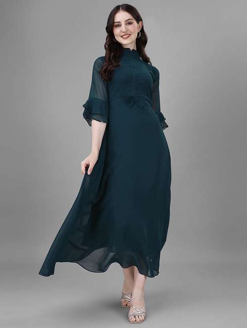 women solid mandarin neck fit & flare maxi dress - 21992635 - Very Small Image - 1