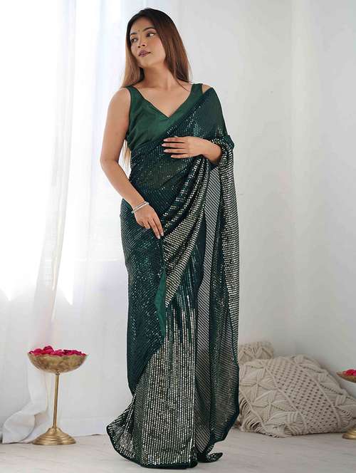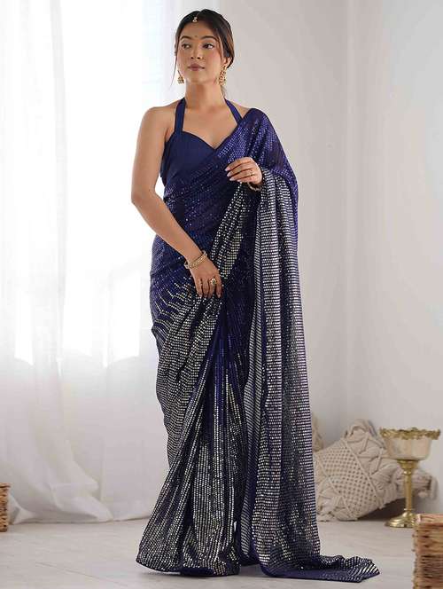 This blue saree is made from georgette fabric and is beautifully highlighted with sequins embroidery work as shown. It comes with an unstitched banglori silk blouse piece that you can customize according to your preferred style or design. Perfect for parties and functions, this saree offers a stylish and elegant look. Please note that the actual product may slightly vary in color and design due to differences in mobile or computer screen settings.