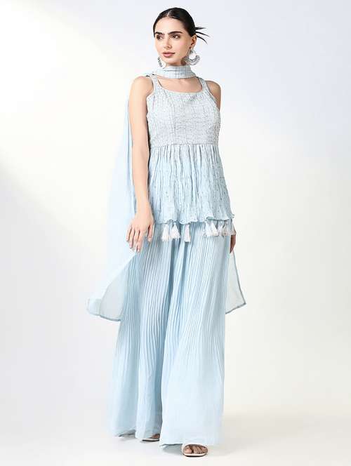 - Find gorgeous sets of ethnic wears in trending designs in light blue colors suitable for casual wear of occasions.