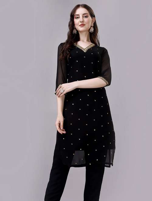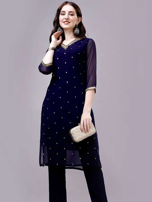 - Grab this beautiful kurta made up of georgette fabric featuring v neck neck designs.