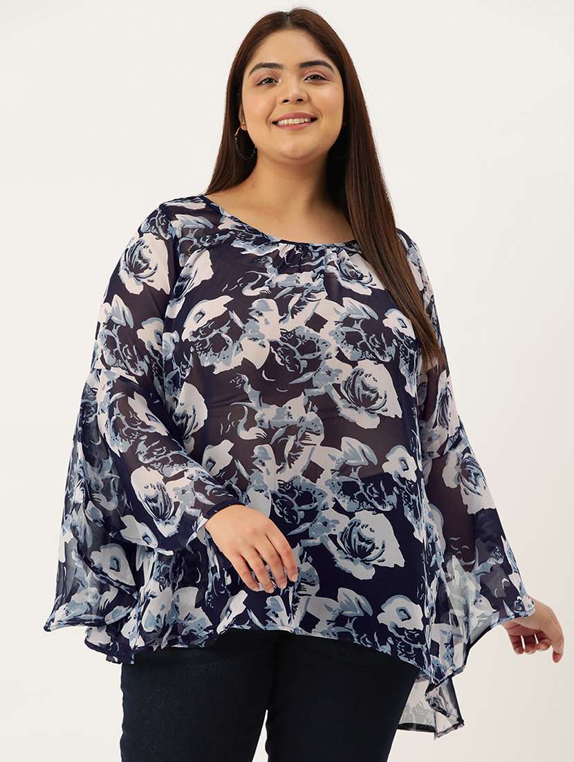 theRebelinme Plus Size Women's Navy Rose Floral Print Georgette Longline Top, has a round neck, Long Sleeves and curved hem.