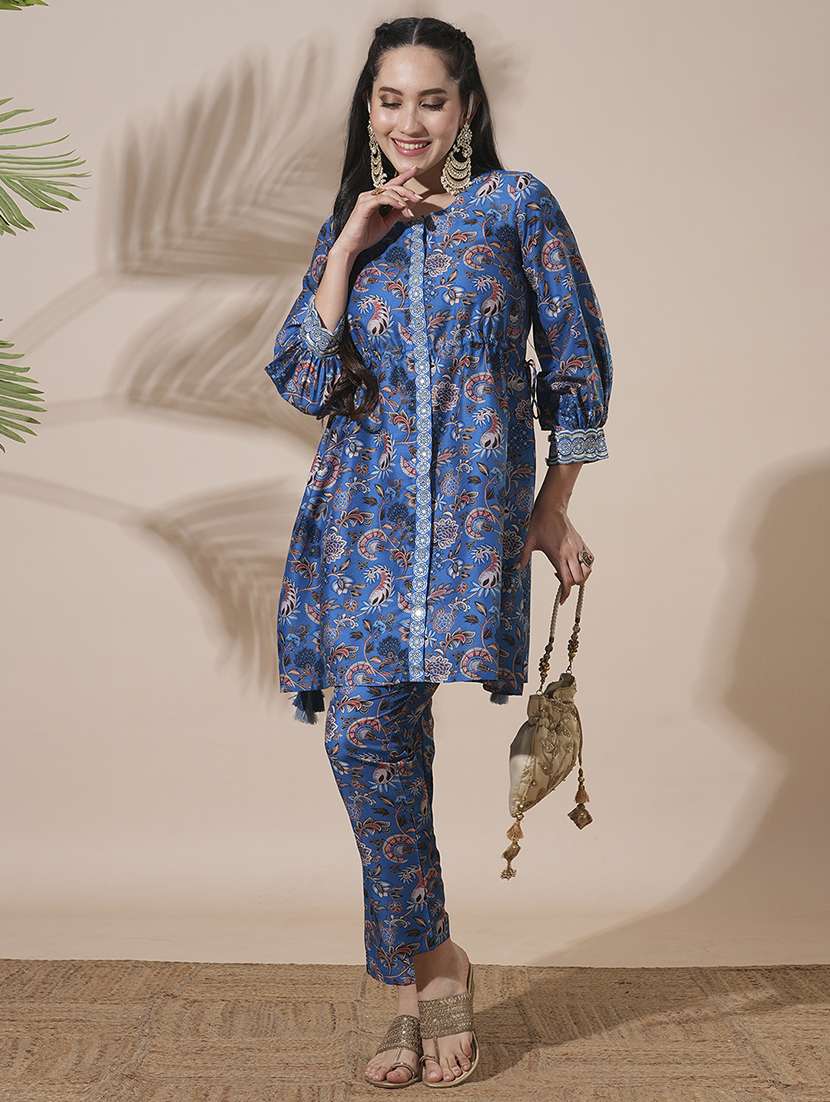 globus women blue round neck floral print drawstring detail tunic with mid-rise narrow pants fusion co-ord set
