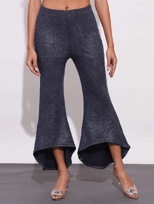 globus women blue sheen self design mid-rise relaxed fit bootcut party treggings
