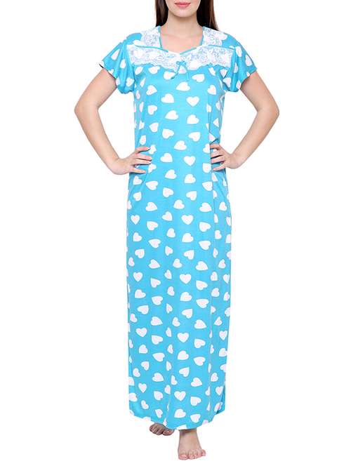 This attractive Women's Long-length Blue Nighty from Secret Wish consists high quality Hosiery fabric and lace work on the neck with heart-shaped polka dots. Best Fits upto 30-36 inch (Chest).