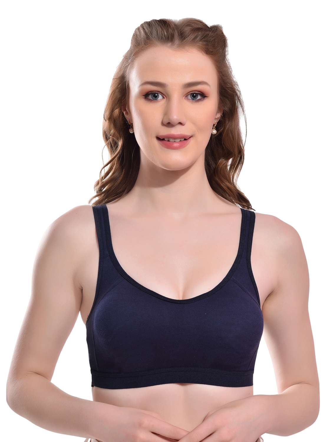 A plain solid stylish sports look moulded cup full coverage non-padded bra is a fashionable and functional bra designed to provide support and comfort for women during their workouts or any physical activity. The bra has a minimalist design with a focus on style and practicality.