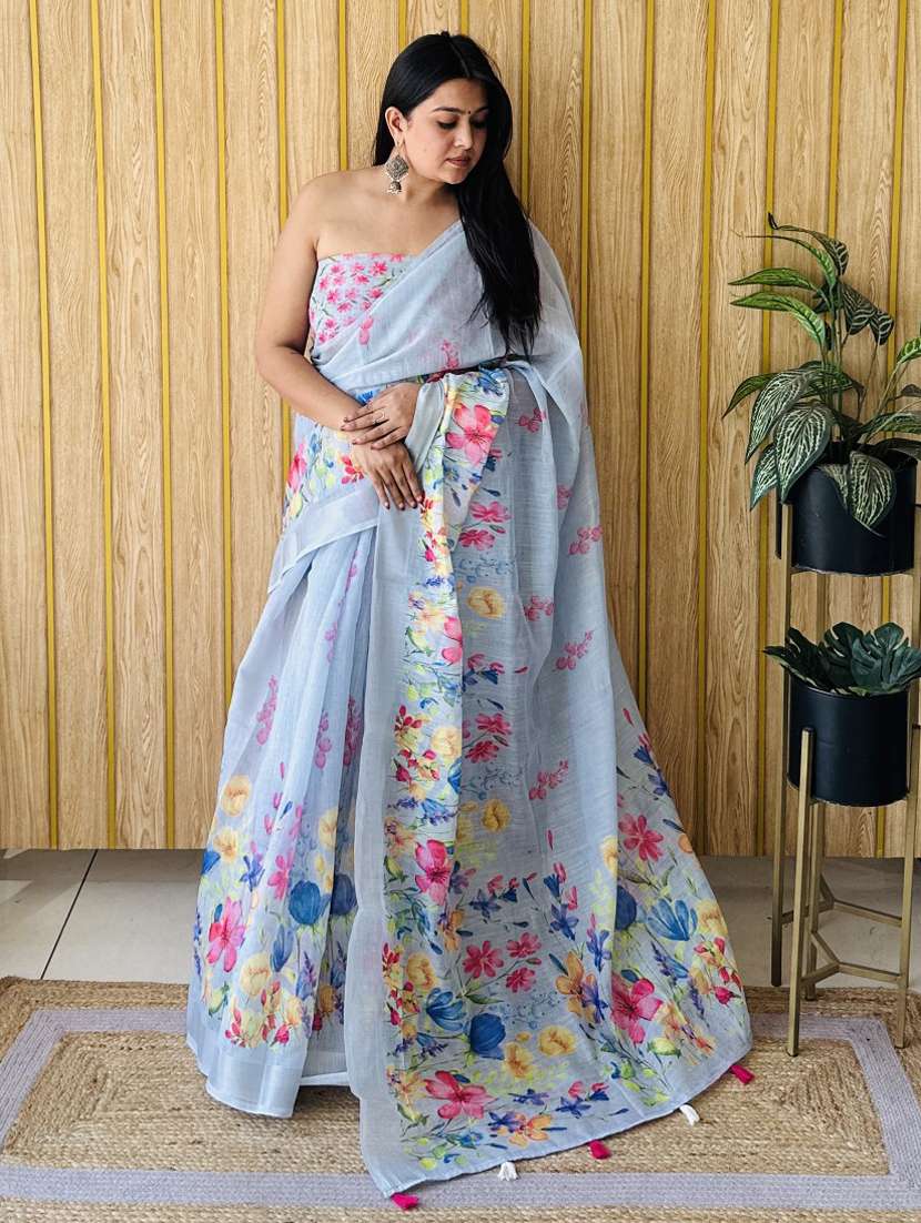 Light Blue Soft Linen Cotton Digital Print Saree With Printed Pallu