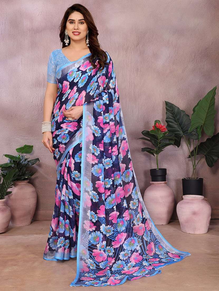 Premium Cotton Linen Fabric Soft, breathable, and lightweight – perfect for all-day festive comfort.Elegant Floral Print Design Vibrant yet graceful floral patterns that add charm and freshness. Wide Satin Border Finish Luxurious satin border enhances the overall richness and appeal. Ideal for Festive & Party Wear Perfect blend of tradition and style for any celebration.