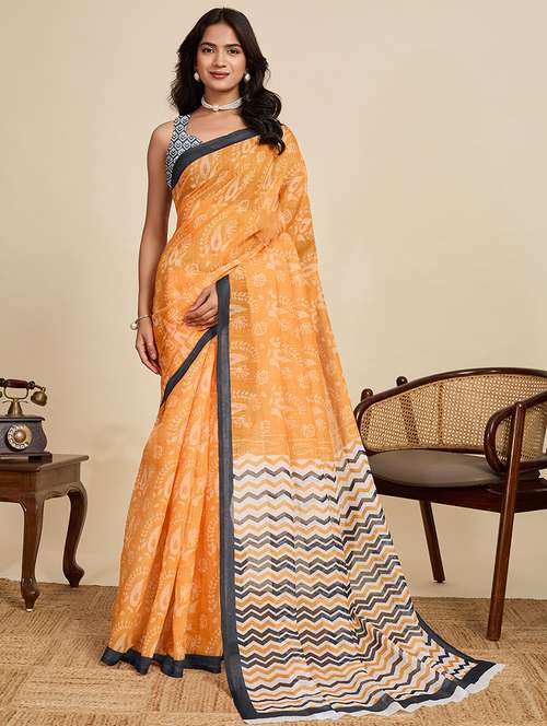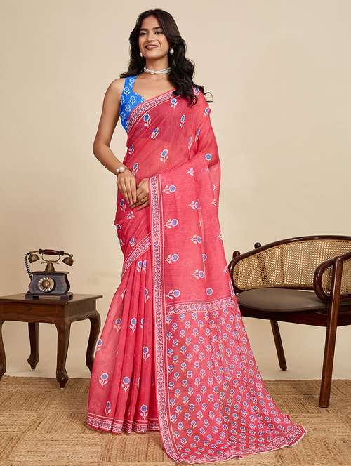 Sky LINAN SAREE WITH JARI BORDER ALL OVER SINGL COLOUR PRINTED WITH BLOUSE.