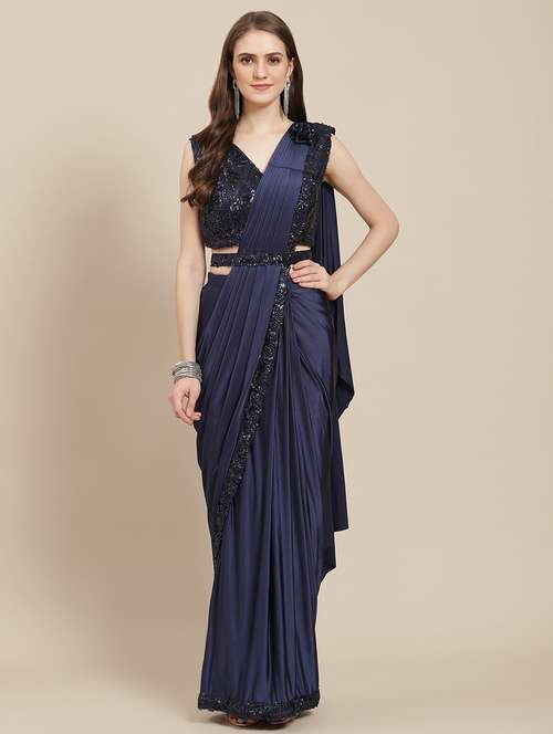 - » women's solid with work navy blue colored saree with blouse
