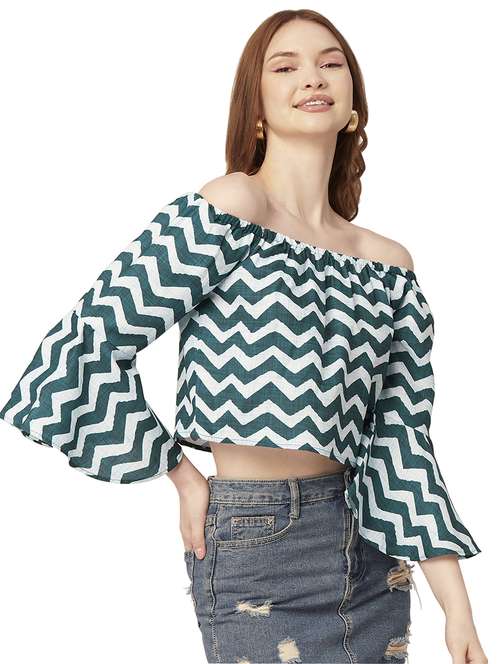 green & white chevron print off shoulder crop top
