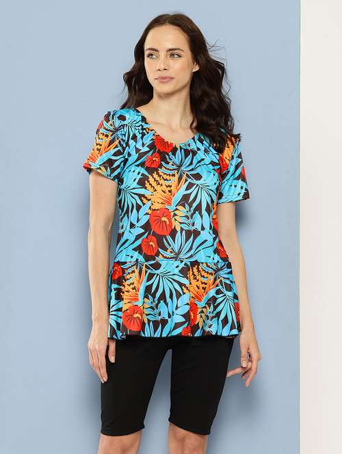 - » women tropical printed round neck swimsuit with cap