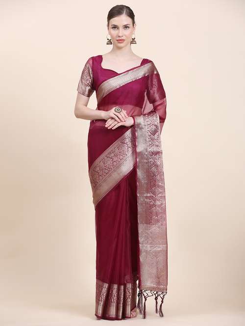 - » women solid zari bordered saree with blouse