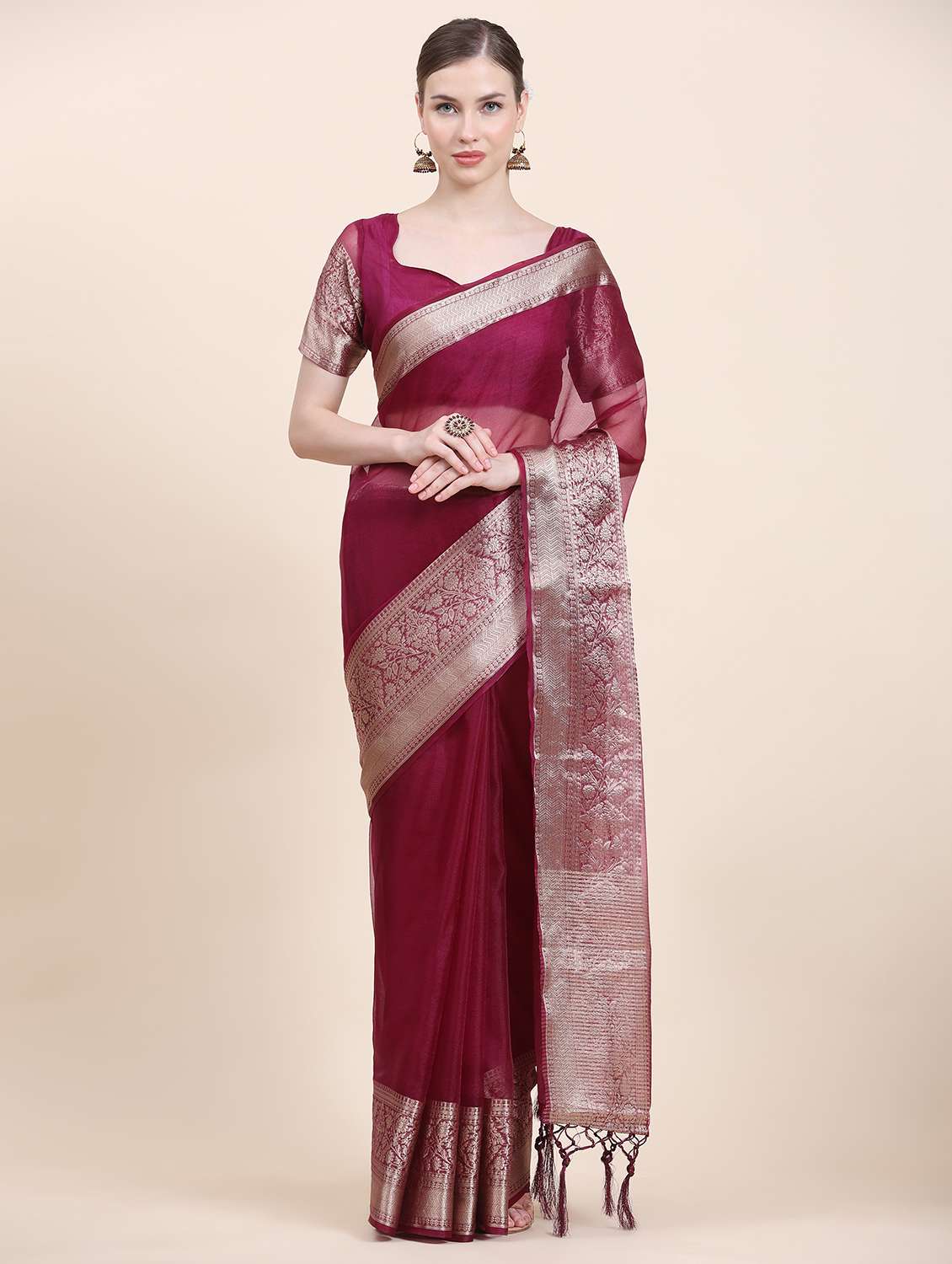 women solid zari bordered saree with blouse
