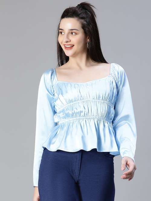 Say hi to this beautiful Toned blue elasticated long sleeve women satin top which is flashy, cool and a perfect pick for party mood to casual occasions. Designed with polyester fabric, it is light in weight, has a great quality fit, and is wearable in all seasons and weather. It features a square neckline, elasticated on the waistline, long sleeves, round hem, and length to the waist. Dipped in an urban look this gen-z top is totally your thing. Geit now. HIGHLIGHTS: 1. Elasticated waist is adding extraordinary style and look. 2. Shiny fabric is for all glam. 3. This top is blended in with lightweight, finest fit, and quality. STYLING 1. It pairs amazingly with white pants, shorts, or a skirt. 2. Goes well with sneakers, heels, or flats, depending upon your mood. 3. Hairband or bandana will supreme the look totally.