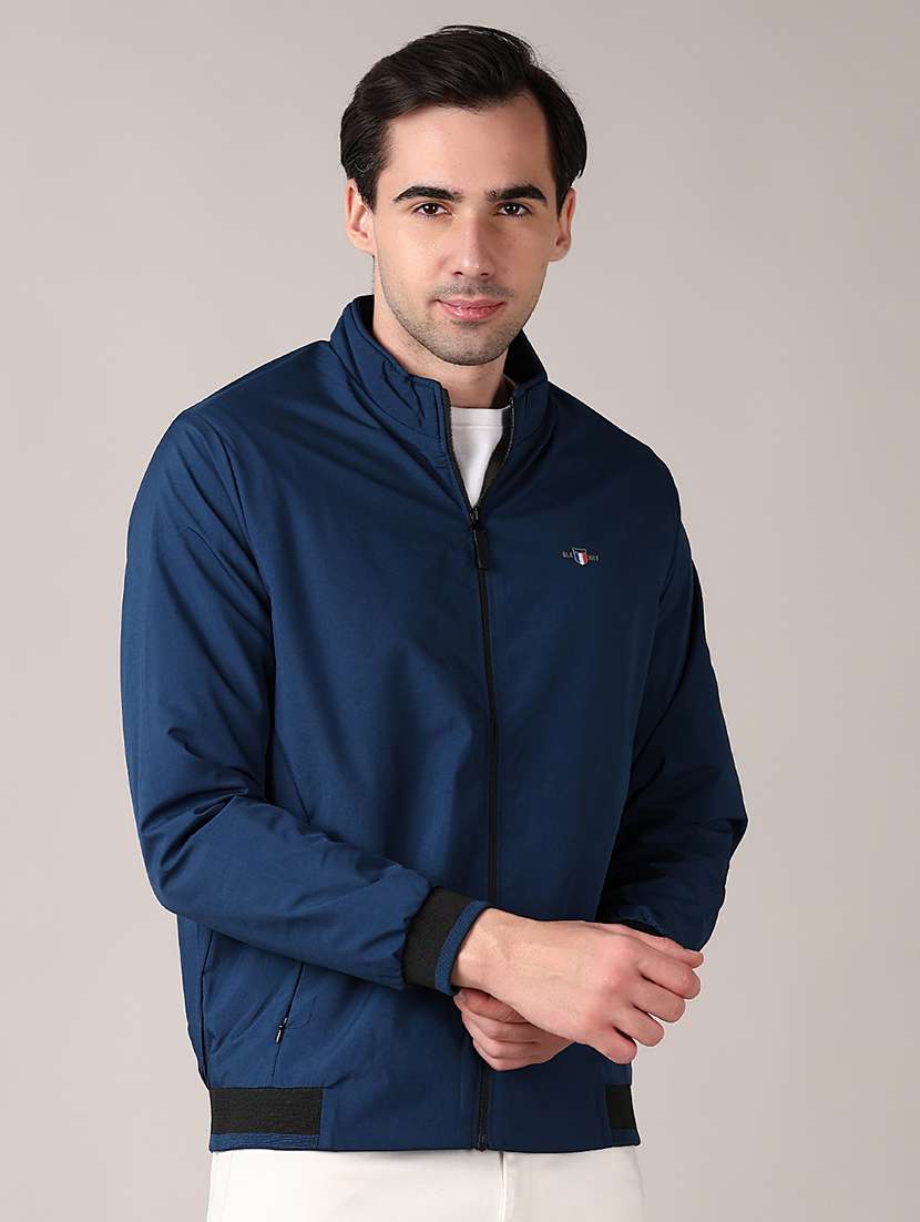 men blue solid long sleeve casual jacket
