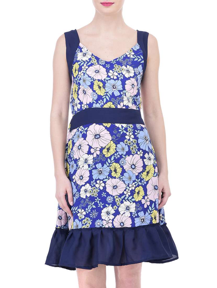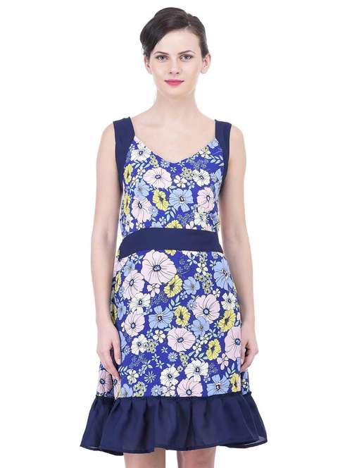 Trendif Polyester Crepe Floral Print Blue Party Wear Casual Print Dress for Women.