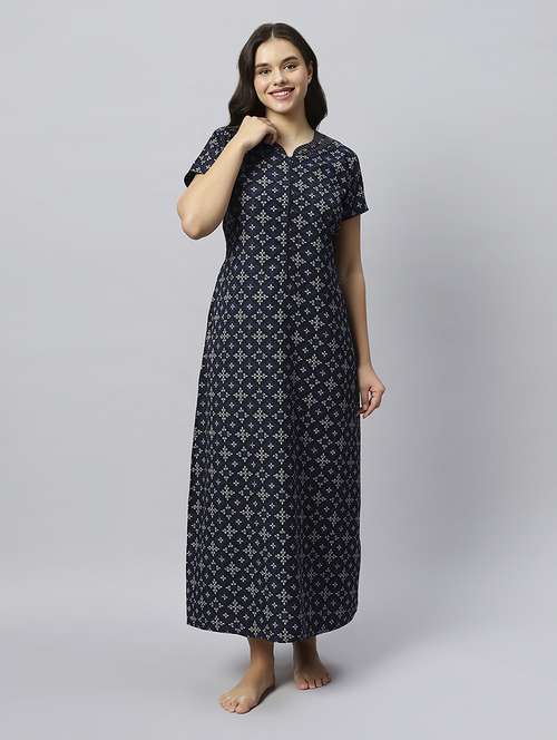 Quira Women's Geometrical Lounge Wear Gown - Blue, Poly Cotton, Regular Fit, Half Sleeves, Round Neck