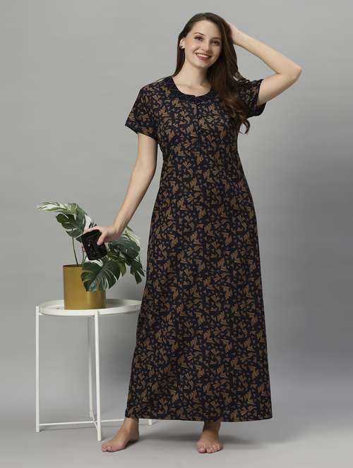 Indulge in luxurious relaxation with Quira's Women's Leaf Print Lounge Wear Gown in a soothing shade of blue. This gown, designed with a regular fit, is perfect for lounging around in style and comfort. Crafted from high-quality Polly Cotton fabric, it offers a soft and breathable feel that's ideal for all-day wear. The elegant leaf print pattern and half sleeves add a touch of grace to your lounging experience, making it suitable for both casual lounging and as cozy nightwear. The round neck design provides a flattering fit, while the gown's long length offers extra coverage and warmth, perfect for those peaceful moments at home. Whether you're winding down after a busy day or simply unwinding during your downtime, this lounge wear gown from Quira ensures you do so in unparalleled comfort and sophistication.