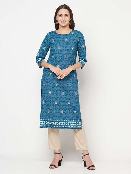 - Grab this beautiful kurta made up of rayon fabric featuring round neck designs.