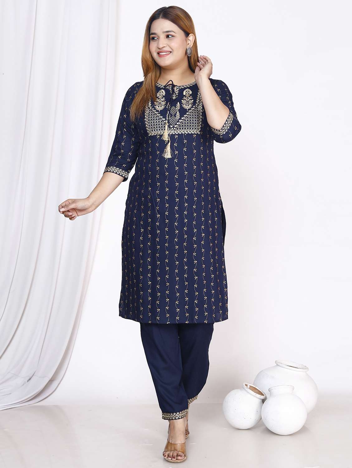 - » women blue tie up neck kurta pant set
