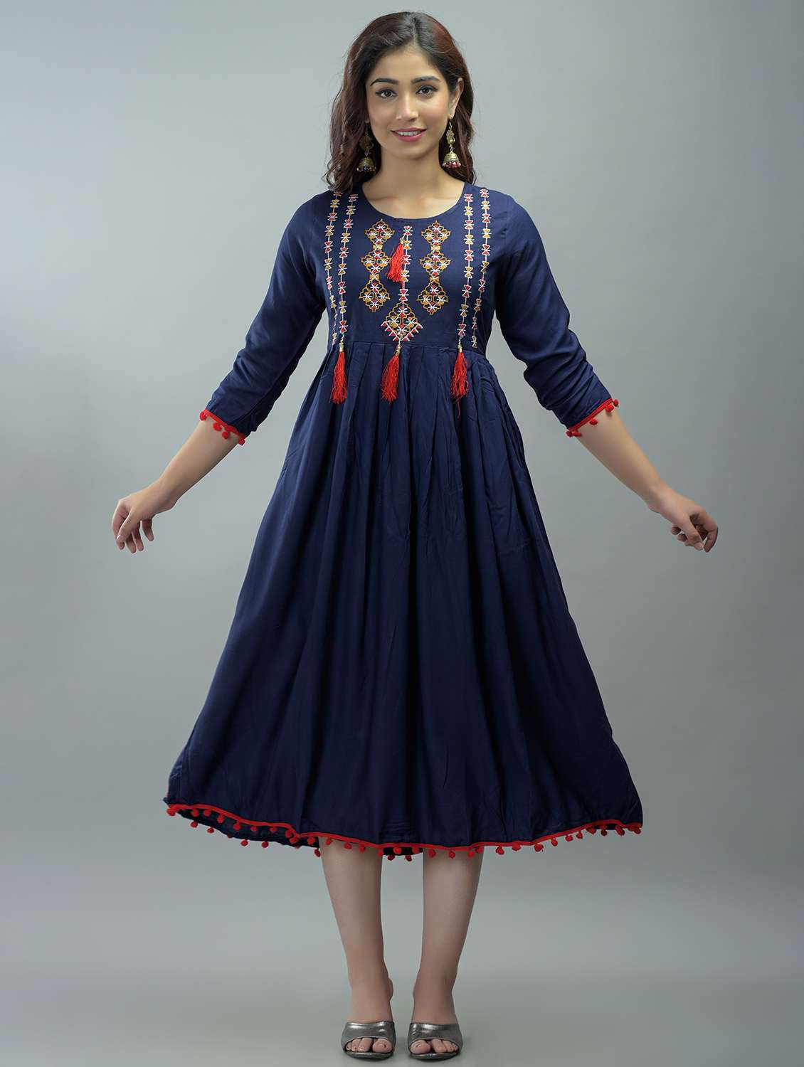 navy blue rayon flared ethnic dress