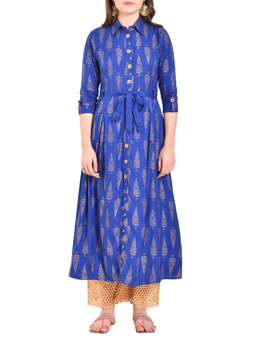 foil print a-line kurta with self fabric belt