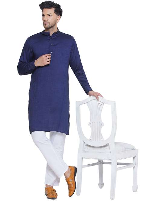 Veera Paridhaan Solid Rayon Long Kurta for Men (Blue, Size: 36)- The Kurta is Ideal to be worn with trousers/Pant Payjama, Churidar or Dhoti .Pair these fashionable Full sleeve Solid Rayon Long Kurta with sandals, mojaris and you can get compliments for your perfect styling. Made from smooth Rayon fabric, this one can surely make you earn brownie points.
