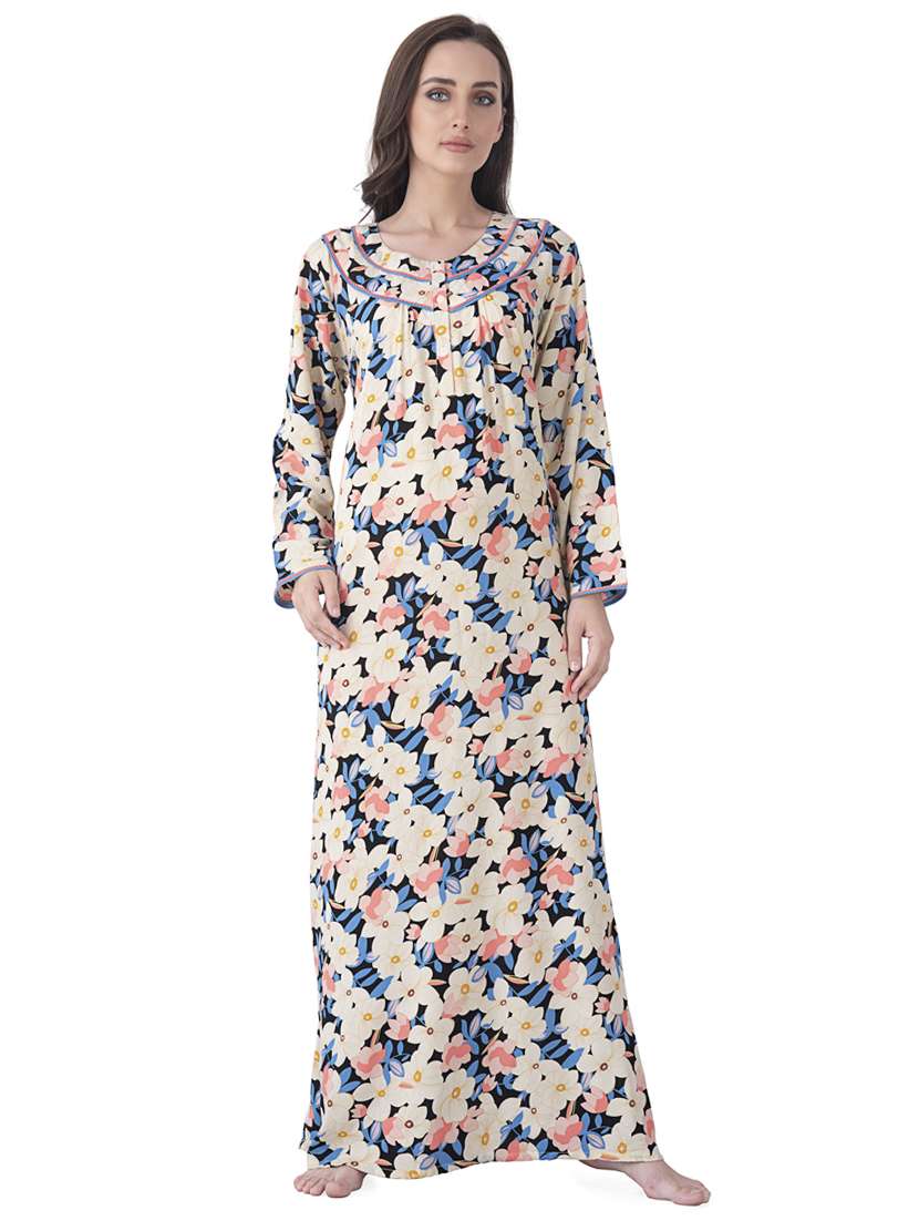 Full length gown with long sleeves. All over floral print. Round neckline with button placket. Crafted with softness and comfort of Rayon rich fabric.