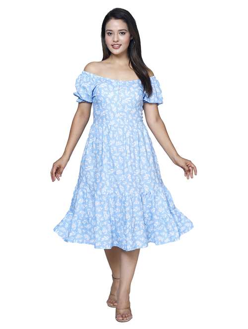 - » women light blue leaf printed off shoulder tiered dress