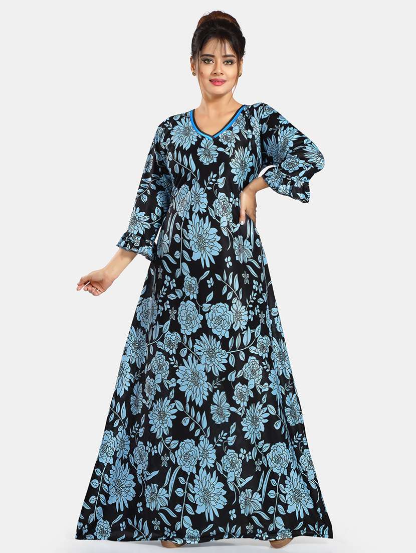 Make your night relax & comfortable with this Sarina Satin Flared Nighty / Nightgown. This floral printed nightgown has flared pattern and attached drawstring for tie up at the back for perfect fitting and has Three Quarter Sleeve & V Neck.. This Nighty is the ultimate blend of comfort and style.