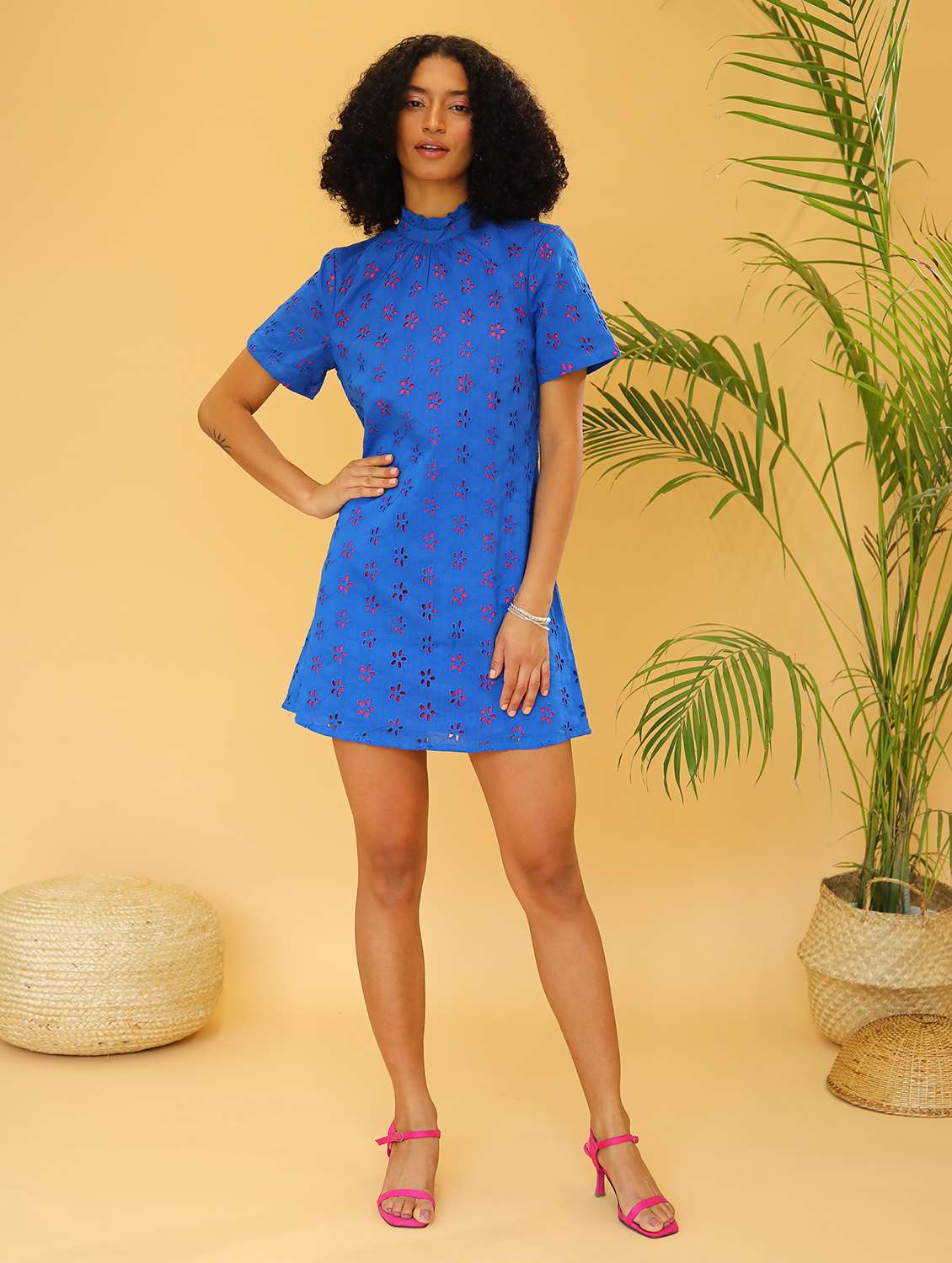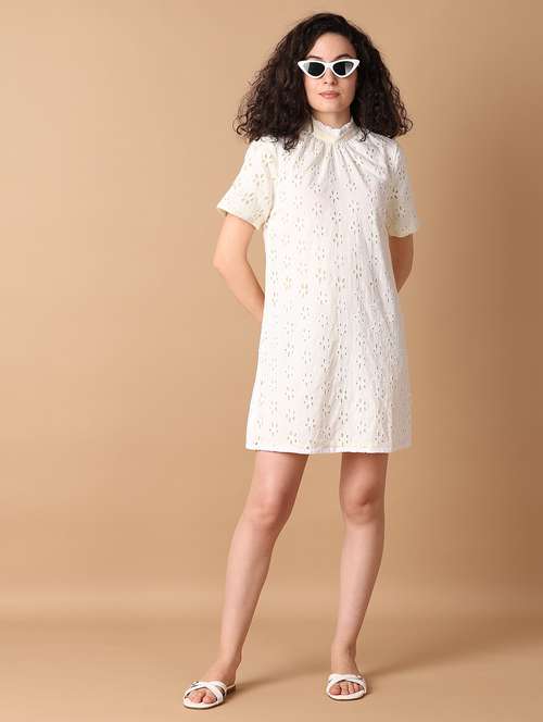 - Dress up in a soothing pattern and don this dress made of schiffli material.