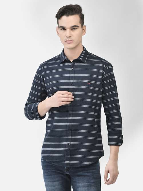 men horizontal stripes navy blue cotton casual shirt