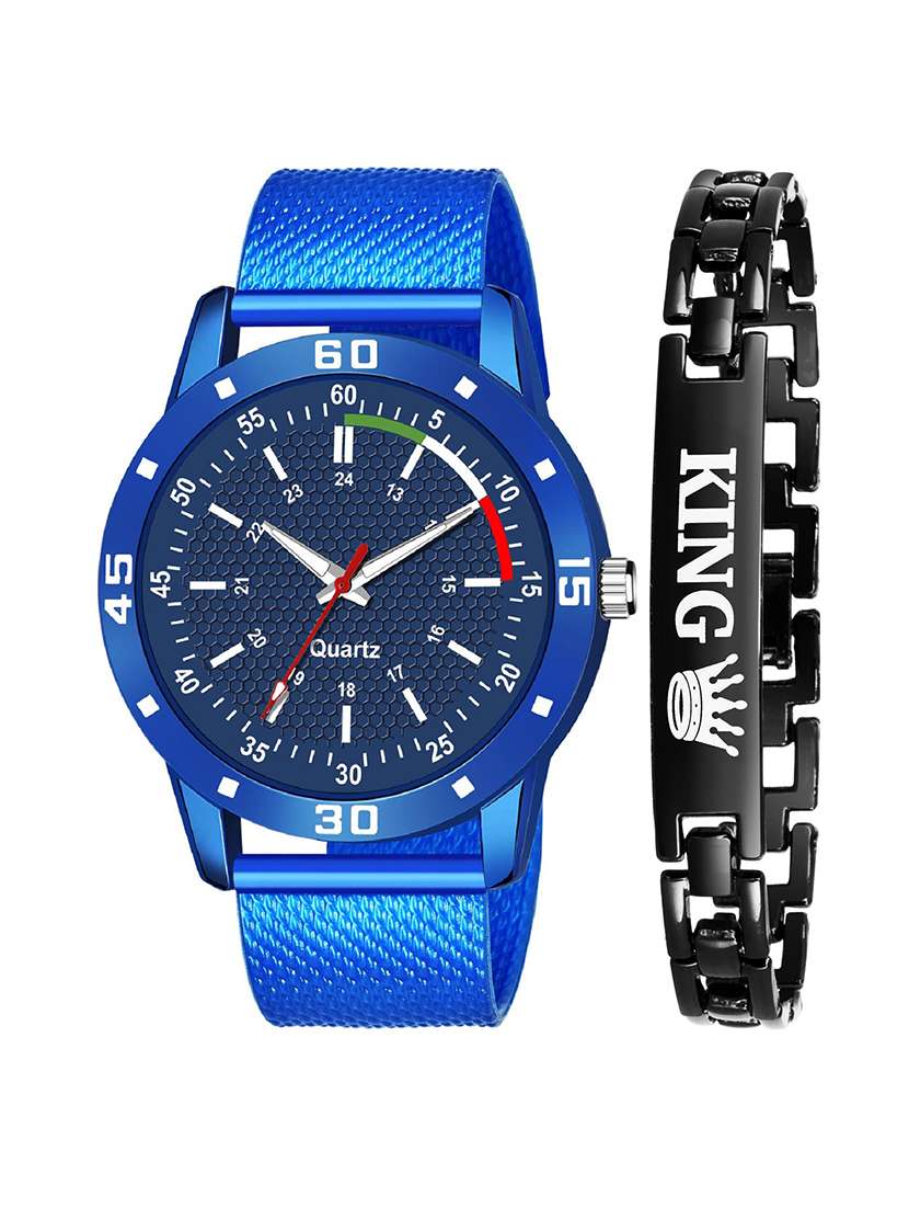 kajaru new fancy stylish - blue pu strap & black king bracelet combo watch