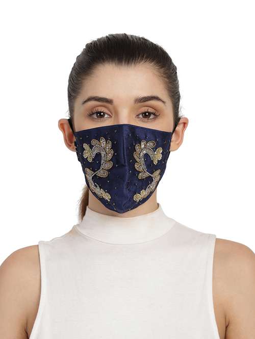 - » 3-ply navy blue & multi art silk embellished fabric fashion mask