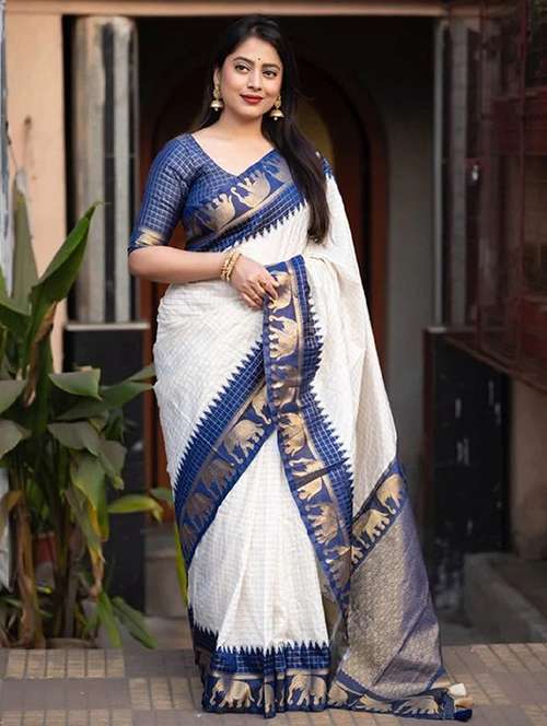 Color : White Blue, Made from high quality Banarasi Silk Fabric Checkered Saree, giving the saree a stunning look and feel.If you're looking for a beautiful saree to wear to a special occasion, this women's Banarasi Silk Checkered saree is sure to impress. With a length of 5.25 meters and an additional 0.80 meters of Cotton Silk Checkered unstitched blouse material, this saree offers ample fabric to create your perfect look.Available in various colors, this saree is perfect for weddings, parties, and other special occasions. Order now and make a fashion statement with this beautiful saree.