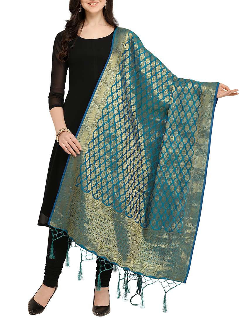 - » blue self designed banarasi dupatta with fringes