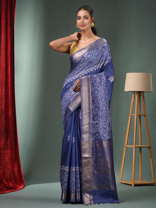 Look royal and loving in this blue handwoven silk blend handloom saree. It has woven designs and patterns for a beautiful look.