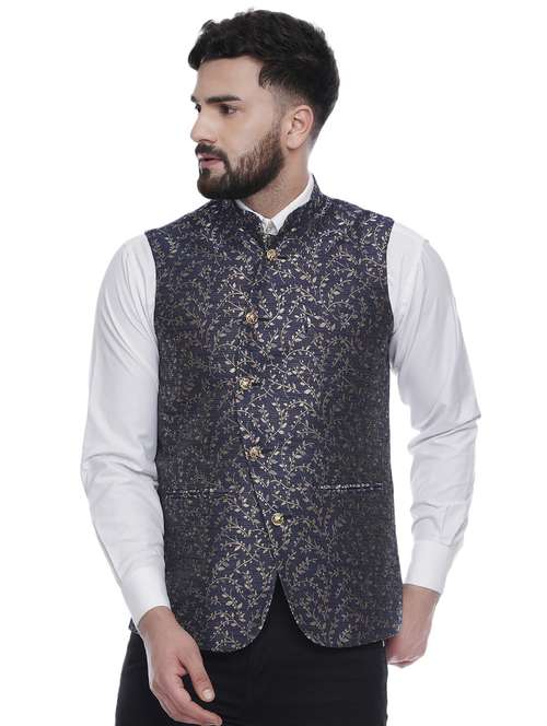 blue jacquard silk blend nehru jacket