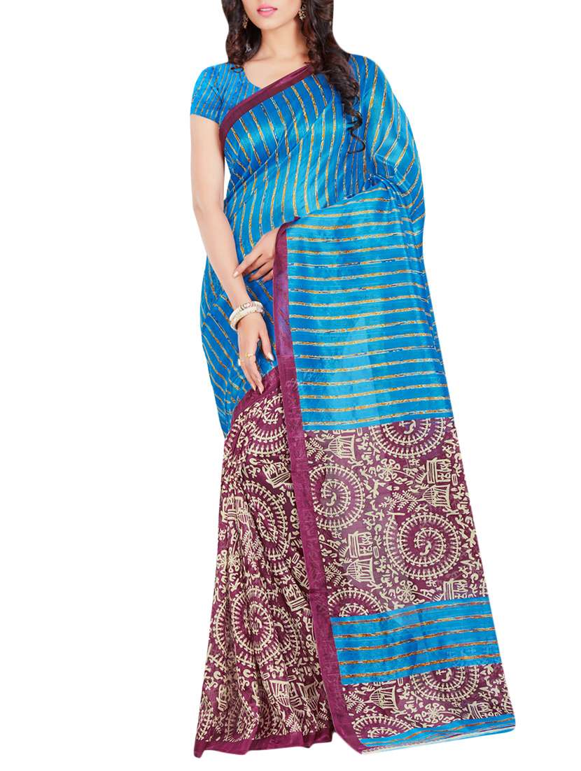 blue & maroon silk printed half and half saree with blouse - 13126640 - Very Small Image - 1