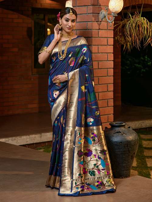 women's self design navy blue colored saree with blouse