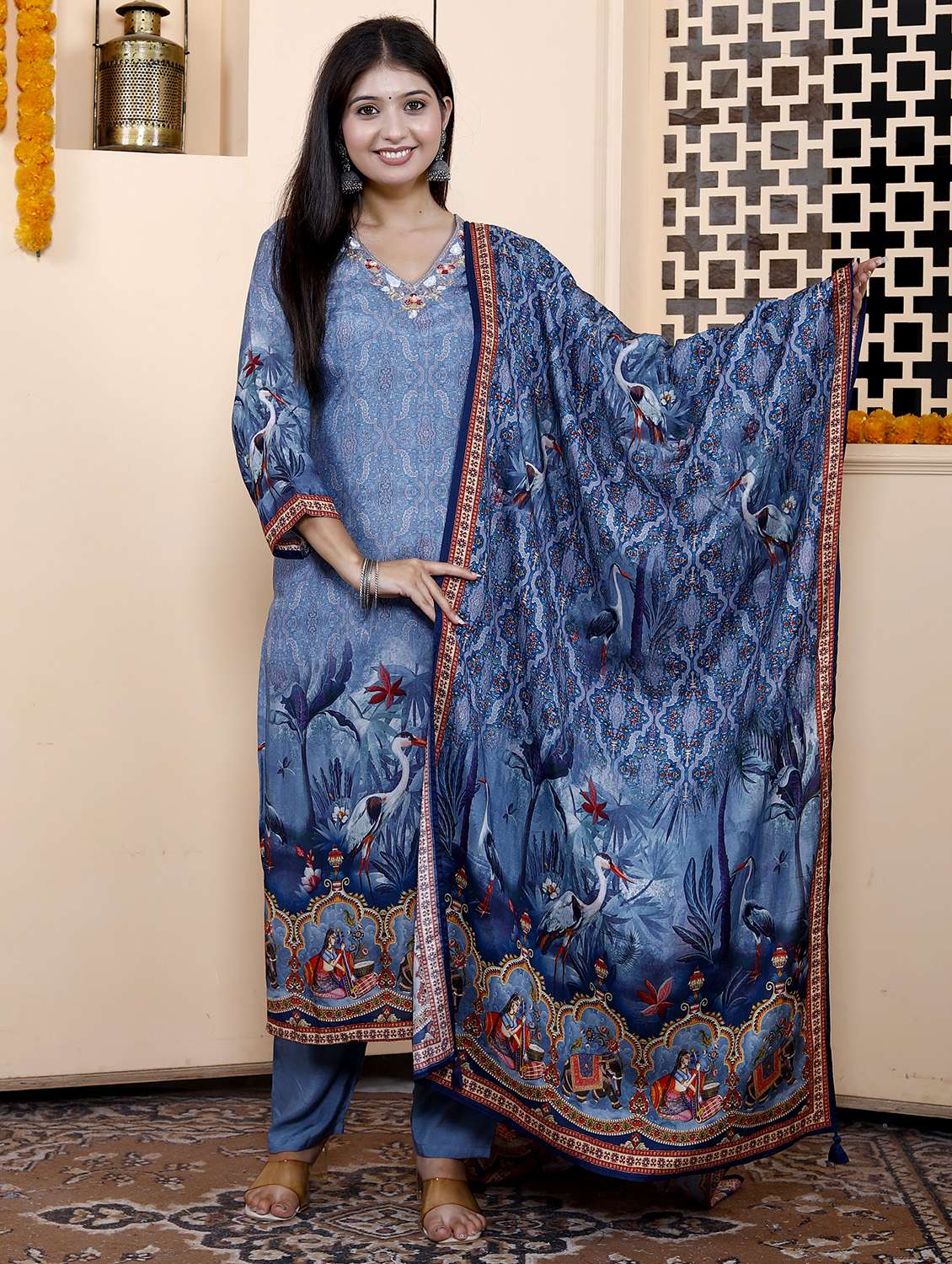 women three quarter sleeve kurta pant with dupatta set
