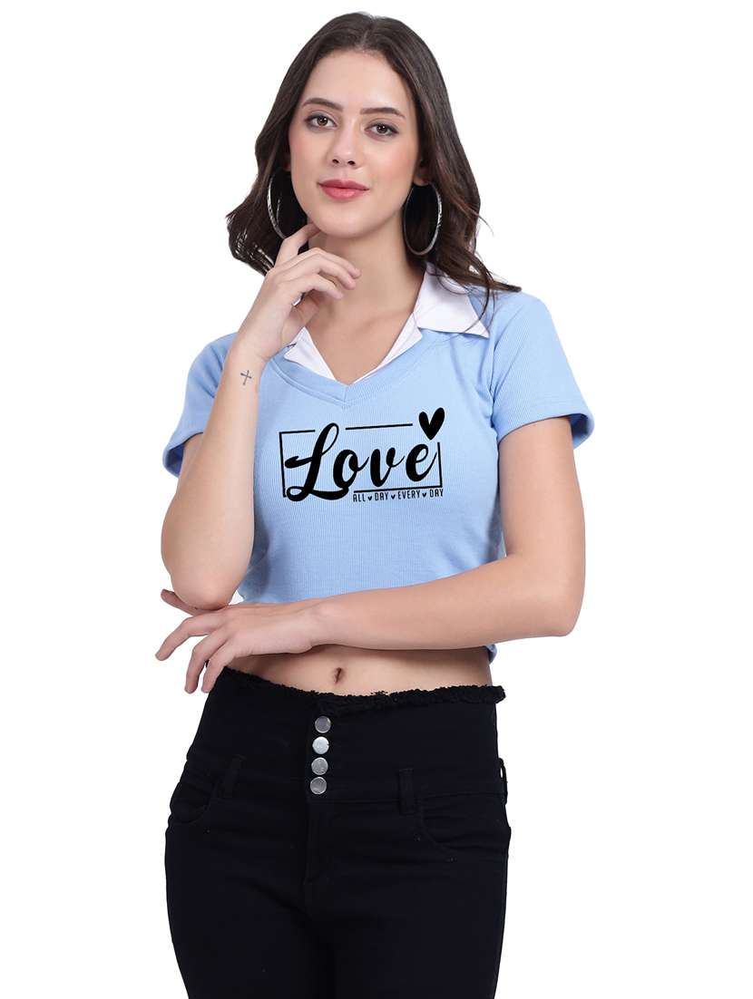 - » women typographic collared cheerleader style crop top