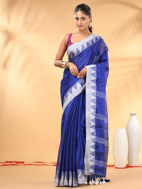 Drape yourself in sheer elegance with this blue tissue saree highlighted with a stunning white woven border. The lightweight and slightly glossy tissue fabric gives the saree a rich texture and a graceful fall. The saree features contemporary geometric woven motifs on the border and pallu, adding a modern ethnic touch to its traditional look. The shimmering silver zari-like detailing on the pallu and border enhances the overall appeal, making it perfect for festive occasions, evening parties, or family celebrations.