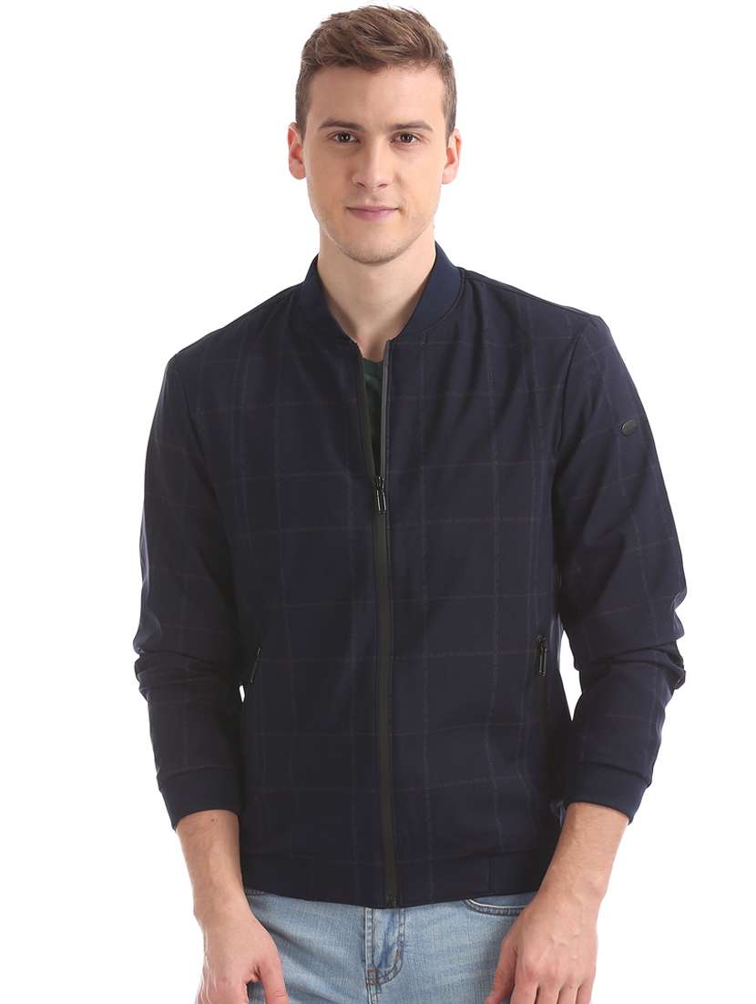 navy blue checkered bomber jacket