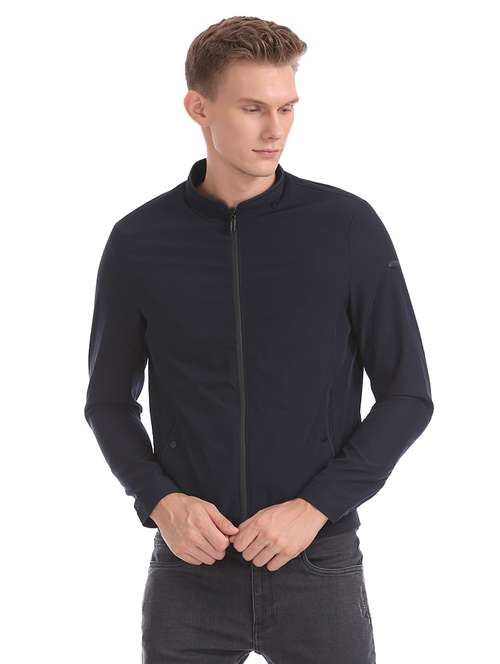- » blue solid bomber jacket