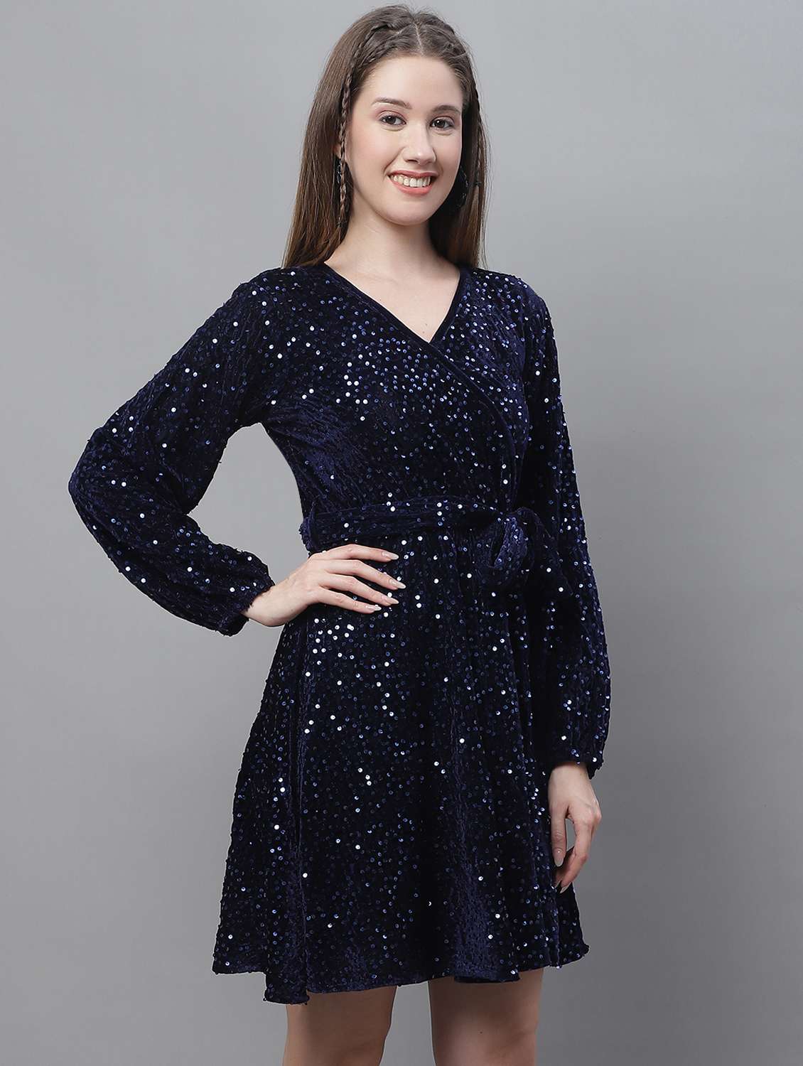 This short dress features a sequin embellishment, overlapping V neckline and full length Puff sleeves,The sequin detail will bring in a charming touch to your party collection. Style it with dainty earrings, stilettoes and clutch to get party ready.
