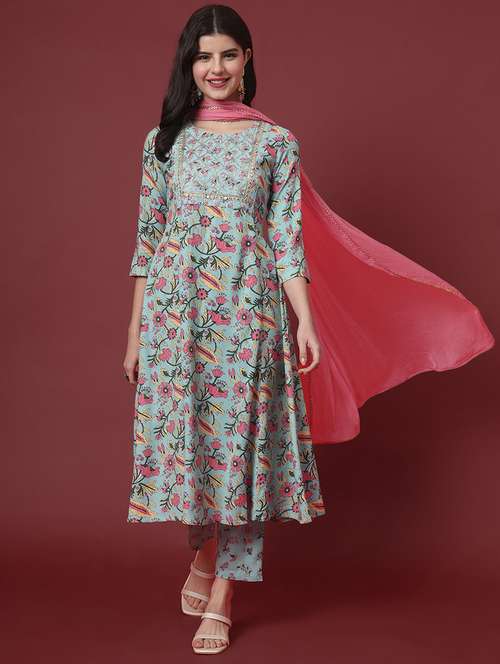 - Find gorgeous sets of ethnic wears in trending designs in light blue colors suitable for casual wear of occasions.
