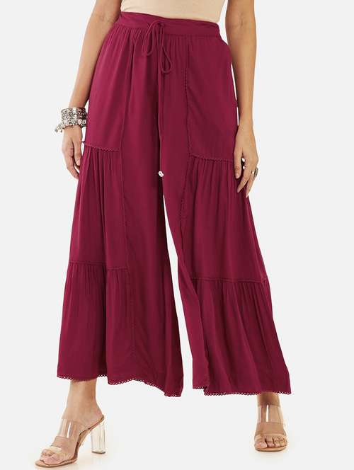 • Find a versatile collection of shararas in magenta colours and viscose fabric that not only gives an outstanding rich look but also ensures breathability and comfort.