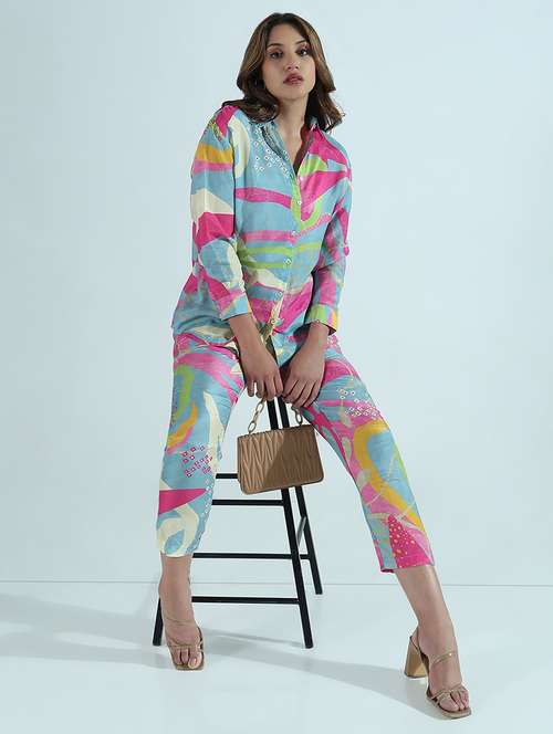 SHOWOFFFF Women's Abstract Printed Blue Co-ords Set with Embellished Collar